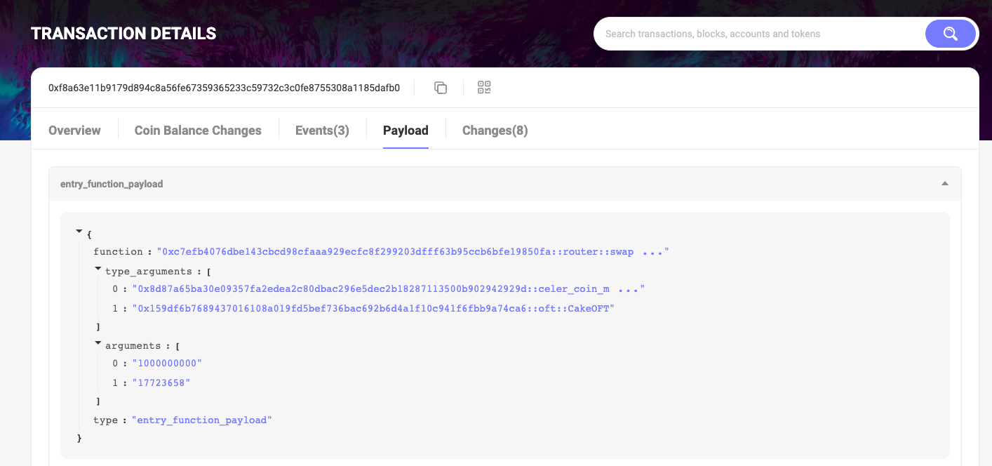 The Transaction Details Payload tab presents the transaction's actual code used. Click the down arrow at the bottom of the code block to expand it and see all contents.